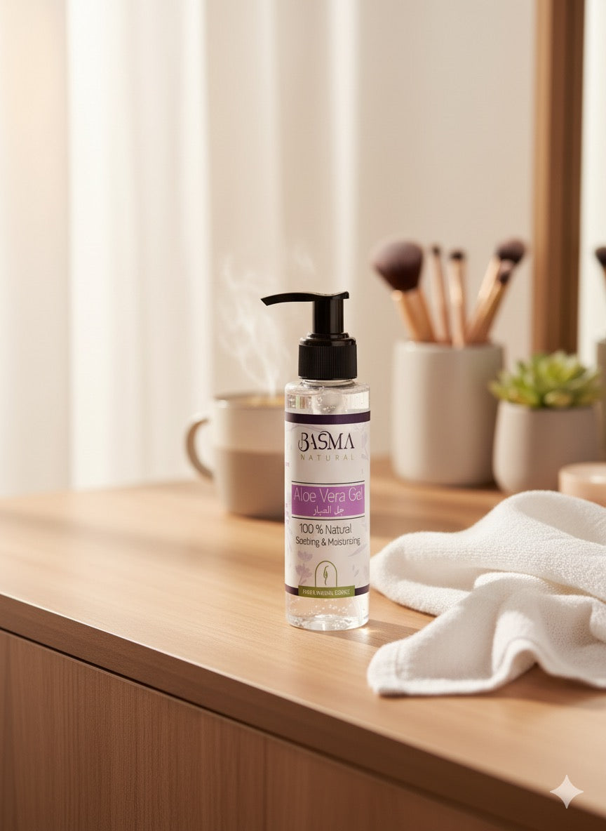 جل الصبار من Basma Natural بتركيبته النقية والطبيعية 100% يعمل على ترطيب البشرة وتهدئة الالتهابات، ويُعتبر من المنتجات الأساسية في روتين العناية لأي نوع بشرة.