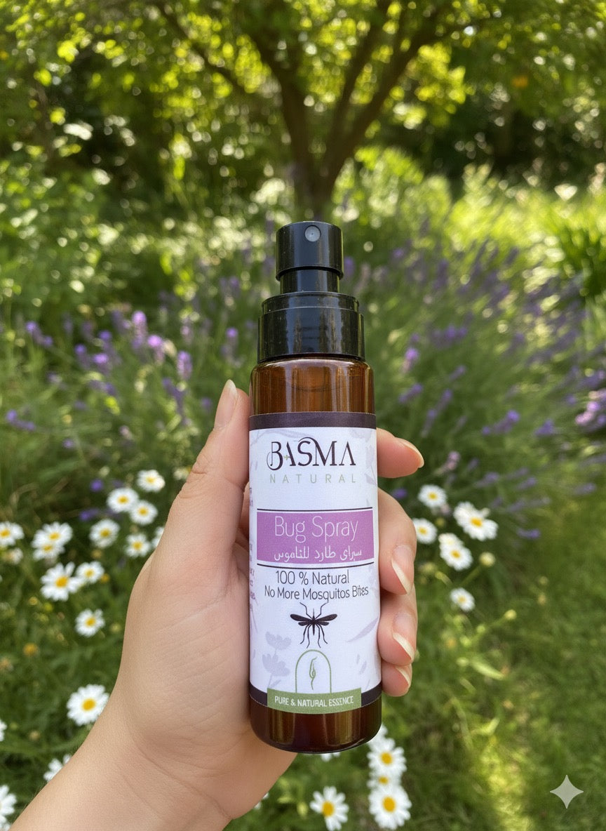 استمتعي بصيف آمن ومنعش مع سبراي طارد الناموس الطبيعي من Basma Natural. تركيبة فعّالة 100% من الزيوت العطرية الطبيعية، مصممة لطرد الحشرات المزعجة بلطف على بشرتك، وبدون أي مواد كيميائية ضارة.